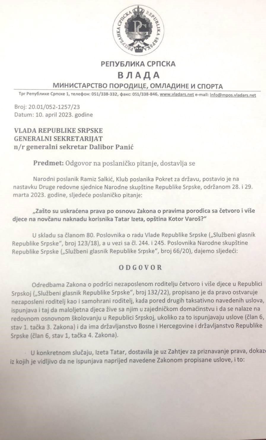 Kako se i pored ovog obećanja pojavio problem kod određenog broja porodica narodni poslanik Salkić uputio je poslanička pitanja prema Ministarstvu porodice, omladine i sporta od kojeg je dobio negativan odgovor koji vam prenosimo u cjelosti.